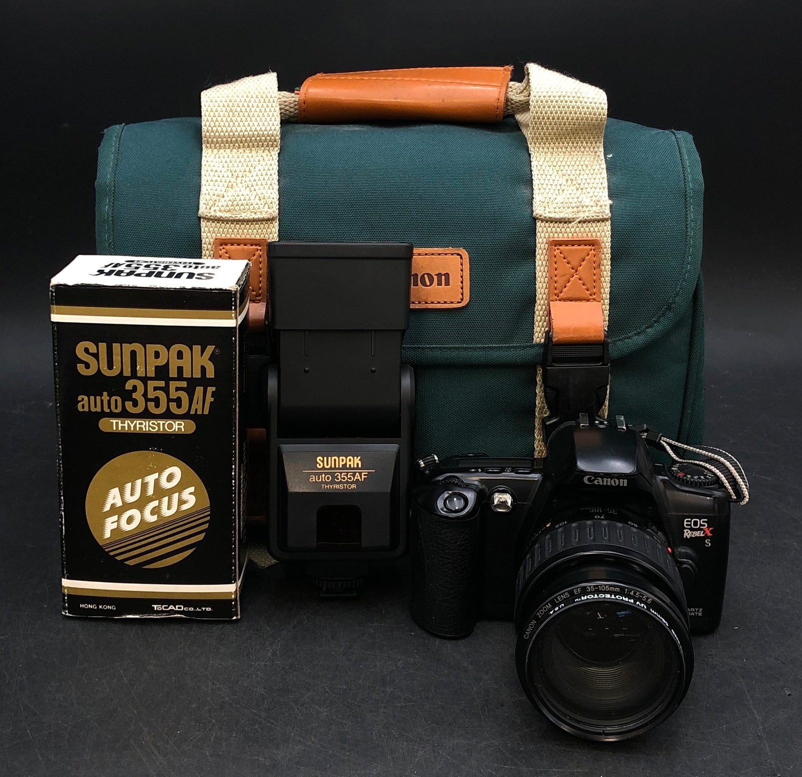 Vintage Canon EOS Rebel S 35mm SLR Camera + 35-105mm EF Lens & Sunpak Flash