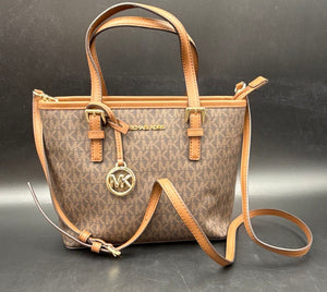 Michael Kors Brown Monogram Jet Set Travel Medium Top Zip Tote Gold Hardware