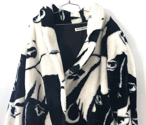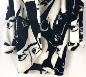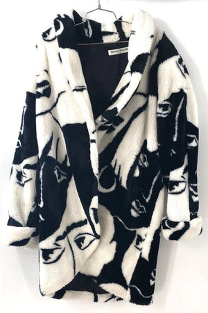 Vintage 80s Faux Fur Coat Black White Faces Print Art