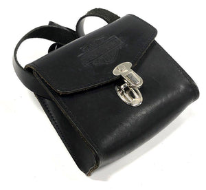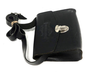 Crafted from durable black leather, this vintage Harley-Davidson crossbody bag features a rugged, minimalist design. The front flap is embossed with the classic bar and shield logo and secures with a silver-tone turn-lock clasp. Its unlined suede interior and raw-cut construction give it an authentic, utilitarian character, perfect for the moto enthusiast.