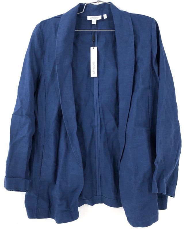 NWT Chico's Women's Blue Linen Blazer Jacket Shawl Collar Full Zip Sz 1 US 8
