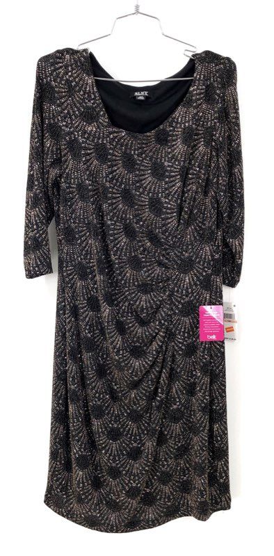 NWT SLNY Women's Party Dress Black Gold Metallic Ruched Fan Pattern Size 14W