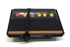 Condition: Consoles are in good cosmetic condition with minor surface scuffs and dust visible in the casing grooves. The wood-grain decorative strips on the front panels are well-preserved across all units. All front-facing buttons are present and intact. The four wired joysticks show standard wear from use; one joystick base has light sticker residue. Integrated AV cables are present and show no visible fraying or damage to the connectors. AC power adapters are not included with this lot.