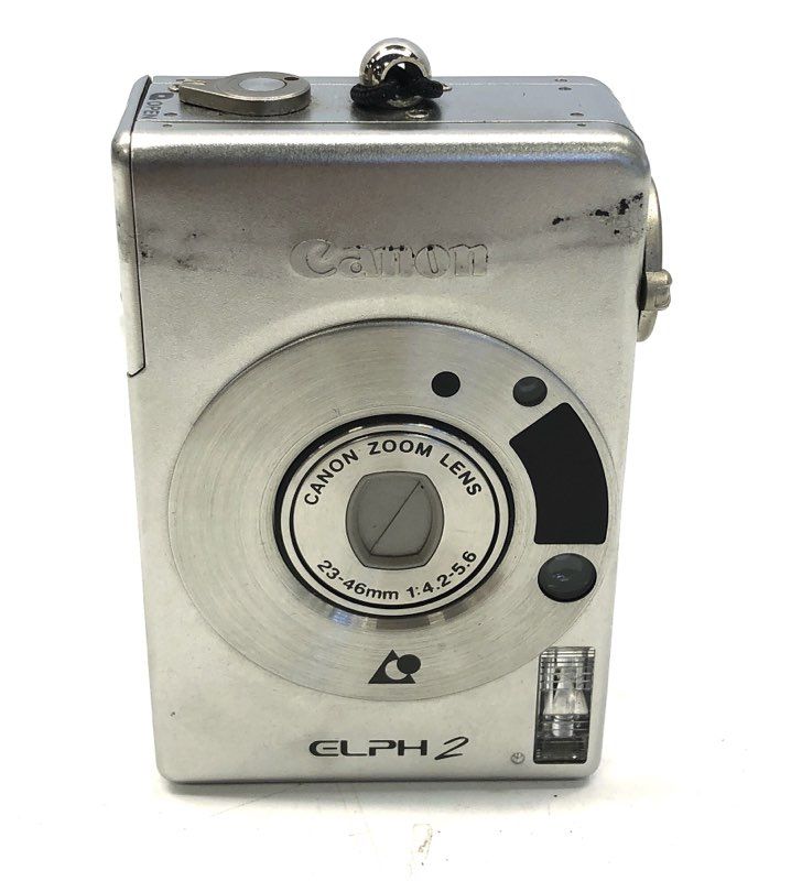 1. Canon ELPH 2 — Silver Advanced Photo System (APS) film camera with 23-46mm f/4.2-5.6 zoom lens and durable metal construction.