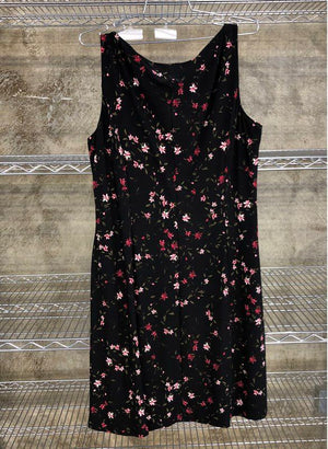 This is a new with tags Chaps women's sleeveless dress in a size XL. The dress features a black base with an all-over ditsy floral print in shades of pink, red, and white. Crafted from a soft, stretchy knit fabric, it has a flattering A-line silhouette and a pull-on design. A fixed knot detail at the waist creates a faux-wrap effect with gentle gathering.