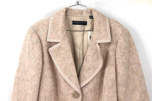 A sophisticated and elegant blazer from Dana Buchman, new with original tags. This piece is crafted from a luxurious wool, cotton, and alpaca blend, featuring a beautiful textured floral jacquard weave in a versatile tan with subtle blush pink undertones. The jacket is fully lined for a smooth drape and comfortable wear, finished with classic notched lapels accented by a contrasting trim. The original retail price was $660.