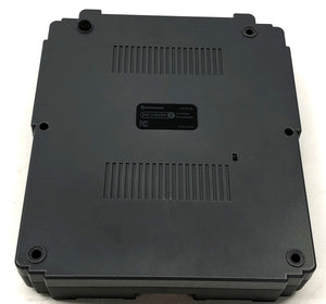 Condition: The console shell is in fair to good cosmetic condition with noticeable surface scuffs and light scratches across the top and bottom panels. There is some visible dust accumulation within the crevices and cartridge slots. The two included controllers are in good physical condition with responsive buttons and intact cords, showing typical handling wear. The AC power adapter is included and the cord is free of fraying. Note: AV composite/S-Video cables are NOT included and will be required for television connection.
