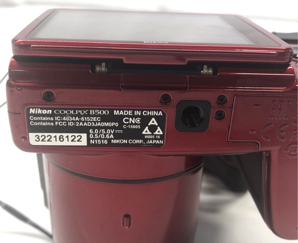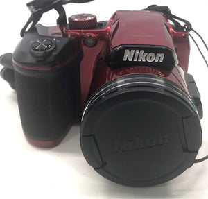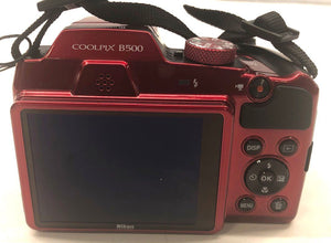 1. Nikon COOLPIX B500 — Red (Plum) body bridge camera. Model clearly visible on top and bottom plate. Features a tilting LCD screen and integrated lens cap.