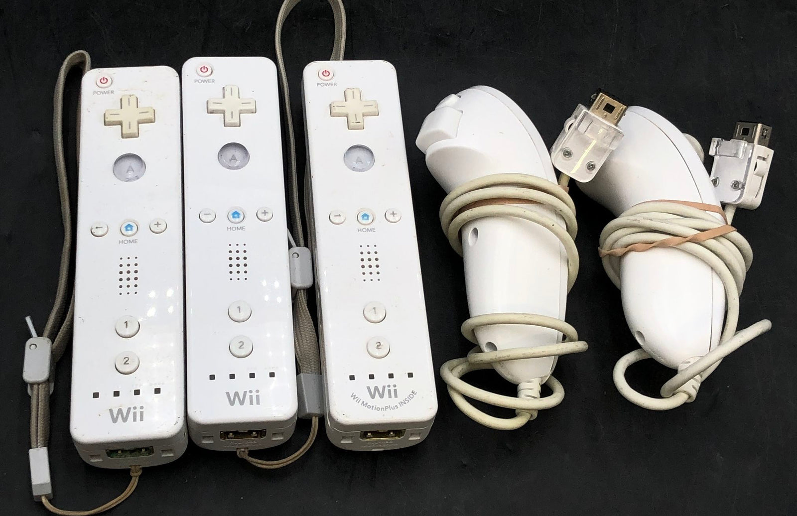Lot of 3 Nintendo Wii Remotes & 2 Nunchuks OEM White (1 MotionPlus)