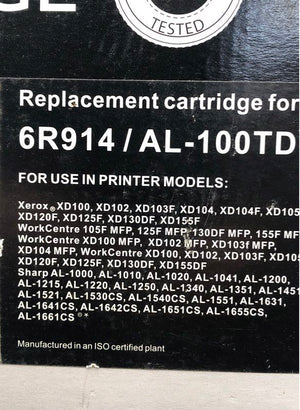 This is a lot of three new old stock imaging cartridges, designed as a direct replacement for part numbers 6R914 and AL-100TD. These third-party cartridges are compatible with a wide range of older Xerox and Sharp printer and multifunction copier models, including the Xerox XD, WorkCentre series and the Sharp AL-1000 series. Please see the box for a comprehensive list of compatible models.