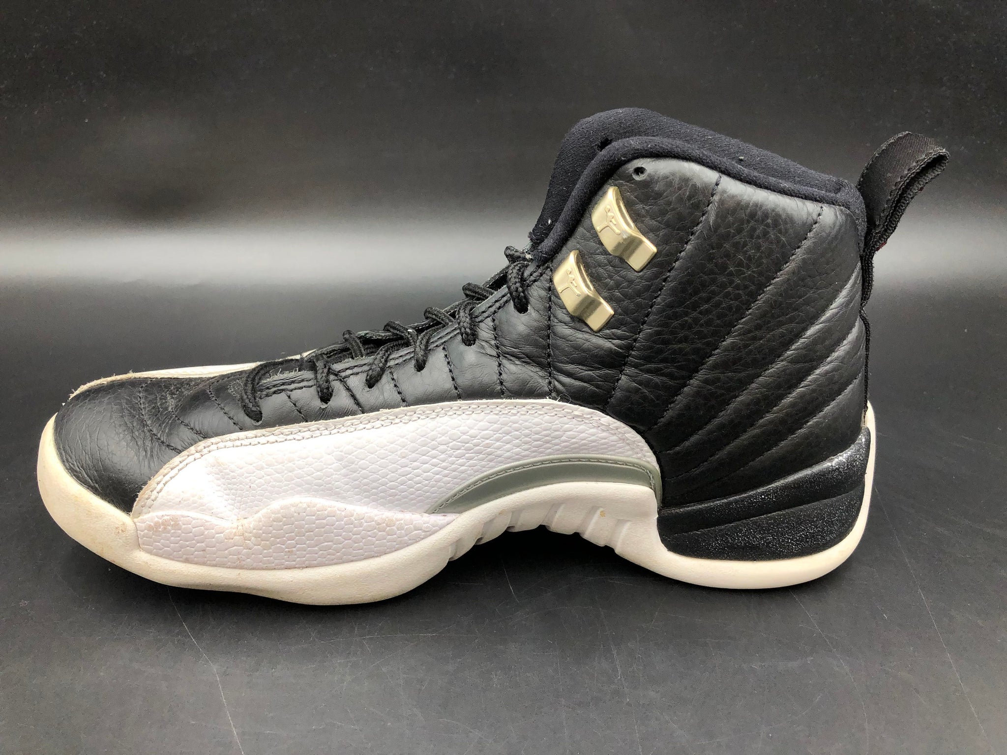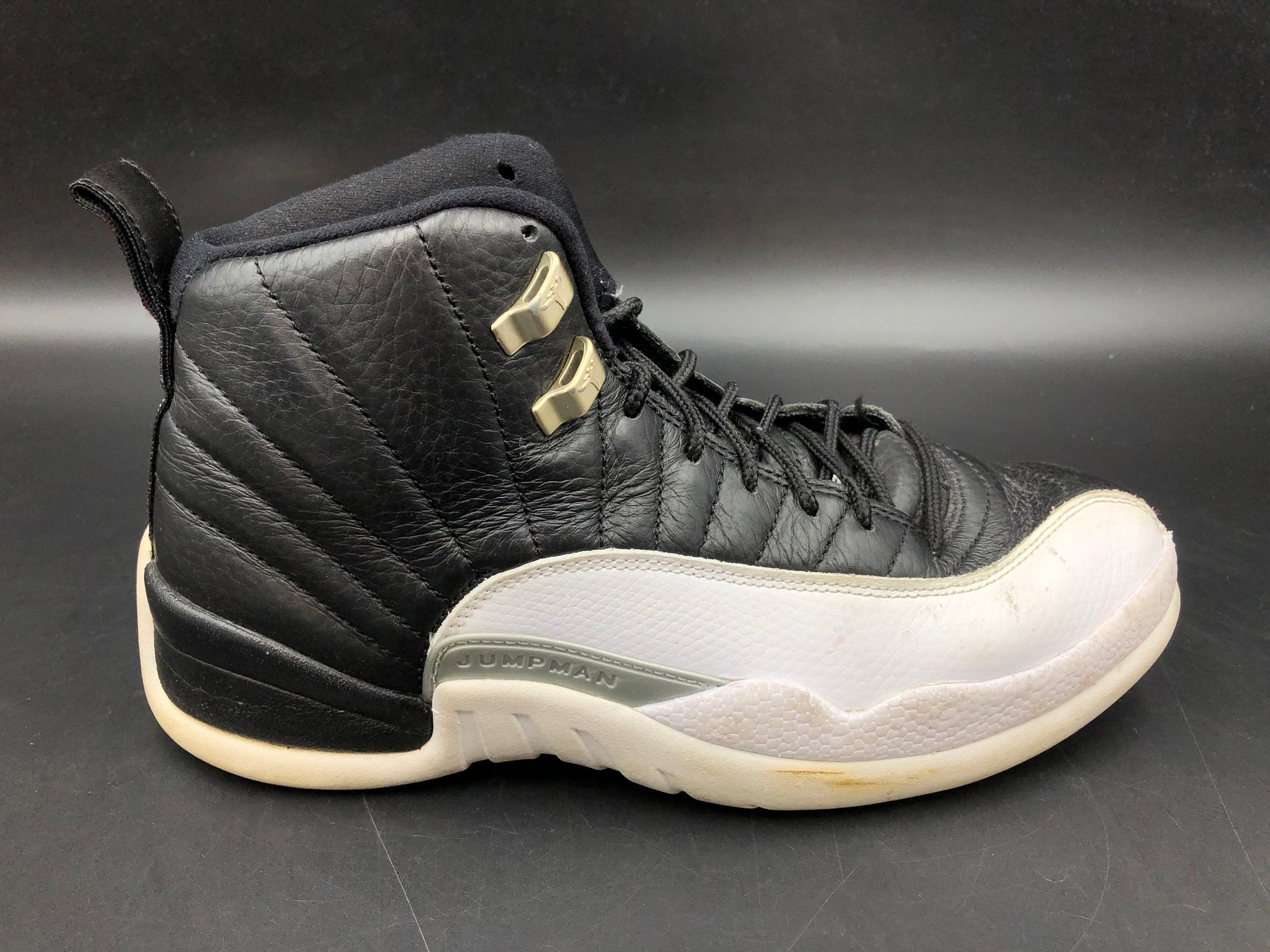 The Air Jordan 12 'Playoff' returned in 2022 to celebrate the 25th anniversary of the silhouette's original release. Famed for being worn by Michael Jordan during his championship-winning 1997 NBA postseason, this model features a premium black tumbled leather upper contrasted by distinct white lizard-textured overlays. The design is elevated by metallic silver top eyelets and signature red Jumpman branding on the tongue and heel, maintaining the iconic Tinker Hatfield-designed aesthetic.