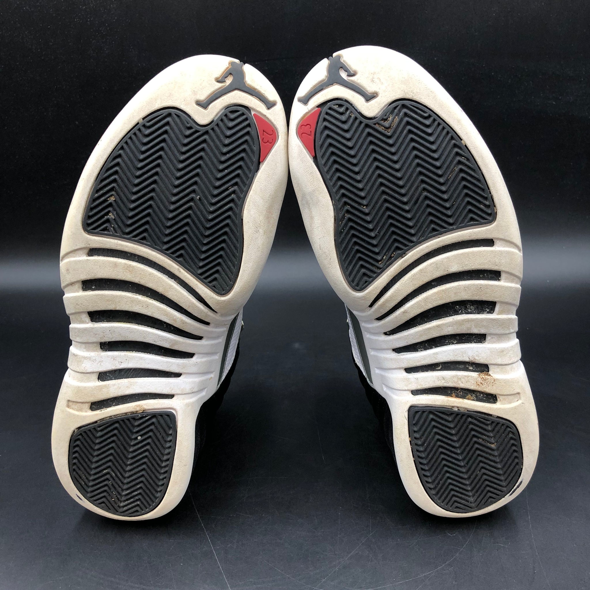 Condition: Pre-owned condition with visible signs of wear. Black leather uppers show moderate creasing. White mudguards exhibit scuffing and dirt accumulation, primarily around the toe boxes and lateral sides. Midsole area shows some paint wear and rubbing on the inner heels. Outsoles show moderate tread wear and surface dirt. Original box included.