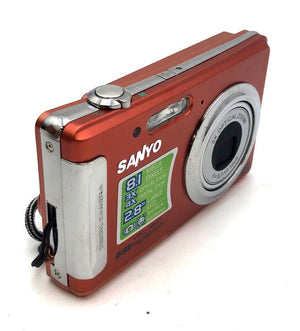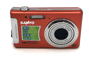 The Sanyo VPC-T850 is a stylish, slim-profile digital point-and-shoot camera featuring an 8.1-megapixel CCD sensor. Released during the height of the compact digital era, this model is finished in a vibrant metallic copper/orange. It offers a 3x optical zoom lens and a large 2.8-inch rear display, making it a desirable choice for those seeking the specific "digicam" aesthetic and color reproduction characteristic of CCD-sensor cameras from the late 2000s.