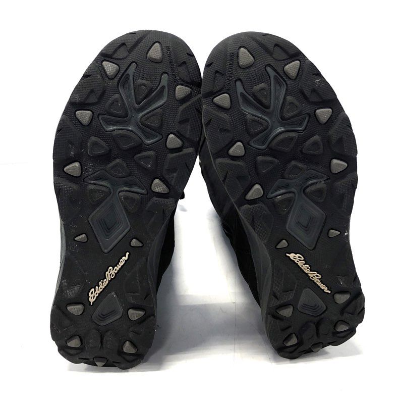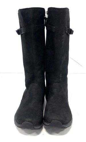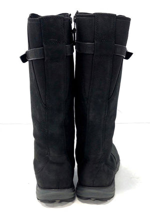 These Eddie Bauer boots combine the comfort of a cushioned athletic sole with the style of a knee-high boot. Constructed with a soft black upper, these boots feature a full-length side zipper for easy wear and a decorative buckle strap at the calf. The flexible, treaded outsole provides reliable traction and support for everyday use.