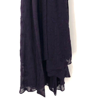This DKNY cocktail dress features a sophisticated deep purple palette accented by subtle metallic vertical pinstripes and a textured clip dot leaf pattern. The silhouette is defined by a deep V-neckline with a crossover wrap-style bodice and elegant bishop sleeves with elasticized cuffs. A self-tie waist belt allows for an adjustable fit, leading to a fluid, tiered skirt with a layered hemline.