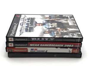 Condition: Overall mixed used condition. No games include manuals. Gran Turismo 4 is a Greatest Hits version and its cover art has sticker residue on the front. The cover for Blitz: The League shows some minor wear. Scaler is housed in a generic black case without its original cover artwork. Discs for Blitz and Scaler are visible and show light surface scratching from normal use. All cases are intact with no major cracks.