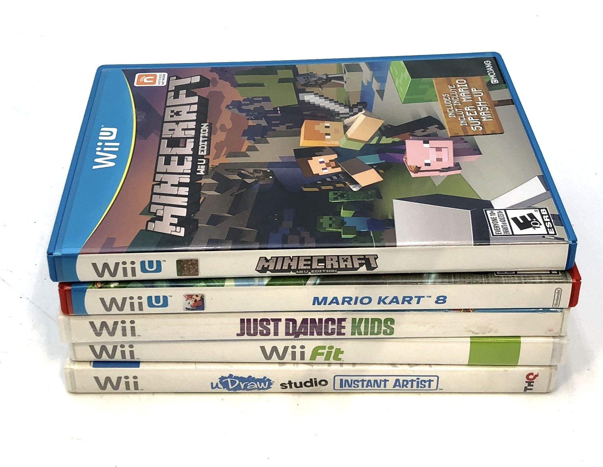 Condition: Overall good condition across the lot. All games come in their original cases with cover art. Cases show light to moderate shelf wear. The Minecraft and Mario Kart 8 cases are clean and intact. The uDraw Studio case has a price sticker on the front cover art and minor soiling on the spine. The other white Wii cases show light general wear. Manuals are not pictured and are not guaranteed to be included.