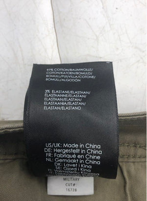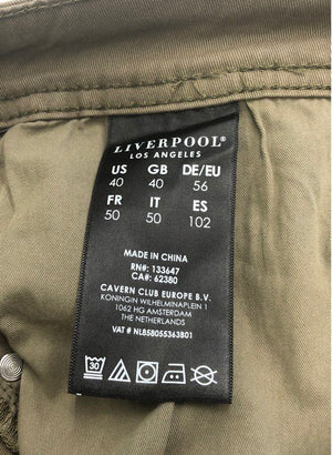 A new pair of Liverpool Los Angeles pants in a versatile military green color. These pants are designed with a 'Modern Straight' fit, offering a classic silhouette. Crafted from a comfortable cotton blend with a hint of elastane for stretch and ease of movement. Features a standard five-pocket design, ideal for everyday wear.