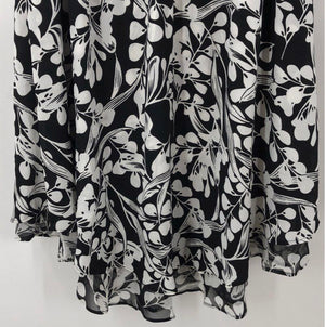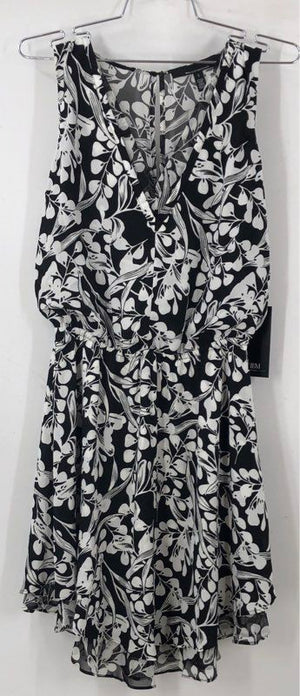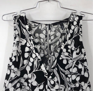 A new with tags White House Black Market sleeveless soft dress in a black and white "Mystic Floral" print. This piece features a lightweight, flowing fabric with a sheer overlay, creating an elegant and airy feel. It has a blouson-style top with a deep V-neckline and an elasticized drawstring waist that flows into a layered, high-low skirt. Designed in the USA.