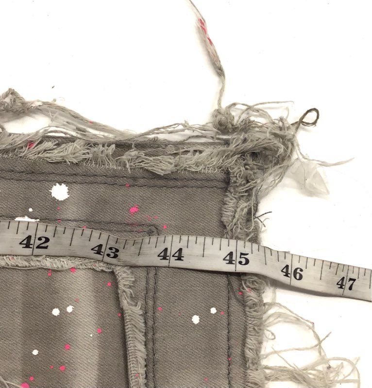 Condition: Very Good. These jeans are intentionally heavily distressed, featuring frayed cutouts, paint splatter, and raw hems as part of the design. There are no signs of unintentional wear, damage, or flaws beyond the original manufactured styling.