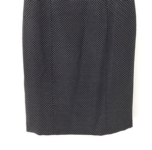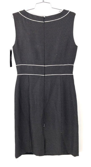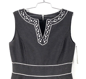 A professional and chic "Sammi" sheath dress from Tahari Arthur S. Levine. This piece is crafted from a textured black and white woven fabric, offering a sophisticated look suitable for the office or special occasions. It features a flattering V-neckline adorned with white beading and contrast white piping that defines the waist. The dress is fully lined with a concealed zipper closure at the back.
