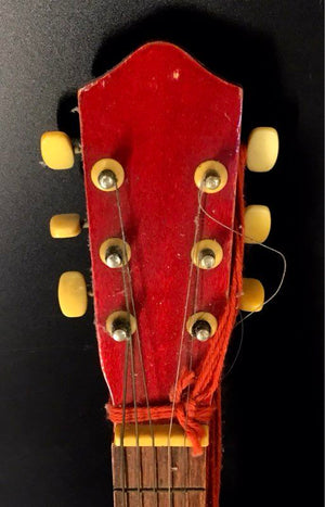 Condition: Fair. Shows cosmetic wear from age, including scratches, scuffs, and finish chips. Hardware has some oxidation. Strings are old and need replacing. The attached red yarn strap is included. Instrument condition assessed visually only.