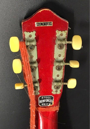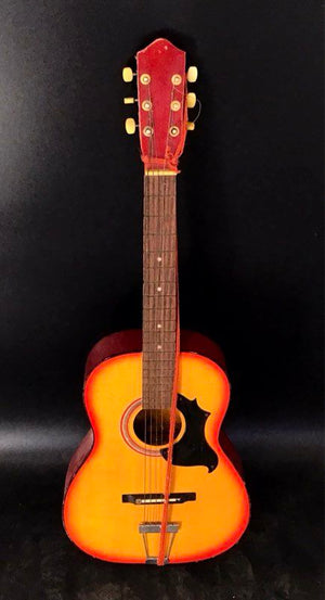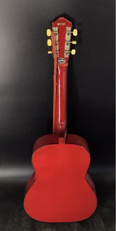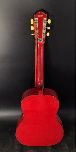 This vintage student-grade acoustic guitar was manufactured in Taiwan, likely in the 1970s-80s. It features a parlor-style body with a sunburst top and a red finish on the back, sides, and neck. Its construction includes a steel-reinforced neck and a floating bridge with a trapeze tailpiece, common for budget instruments of the period. A unique decorative pickguard completes the look. This guitar is suitable as a project for restoration or as a decorative piece.